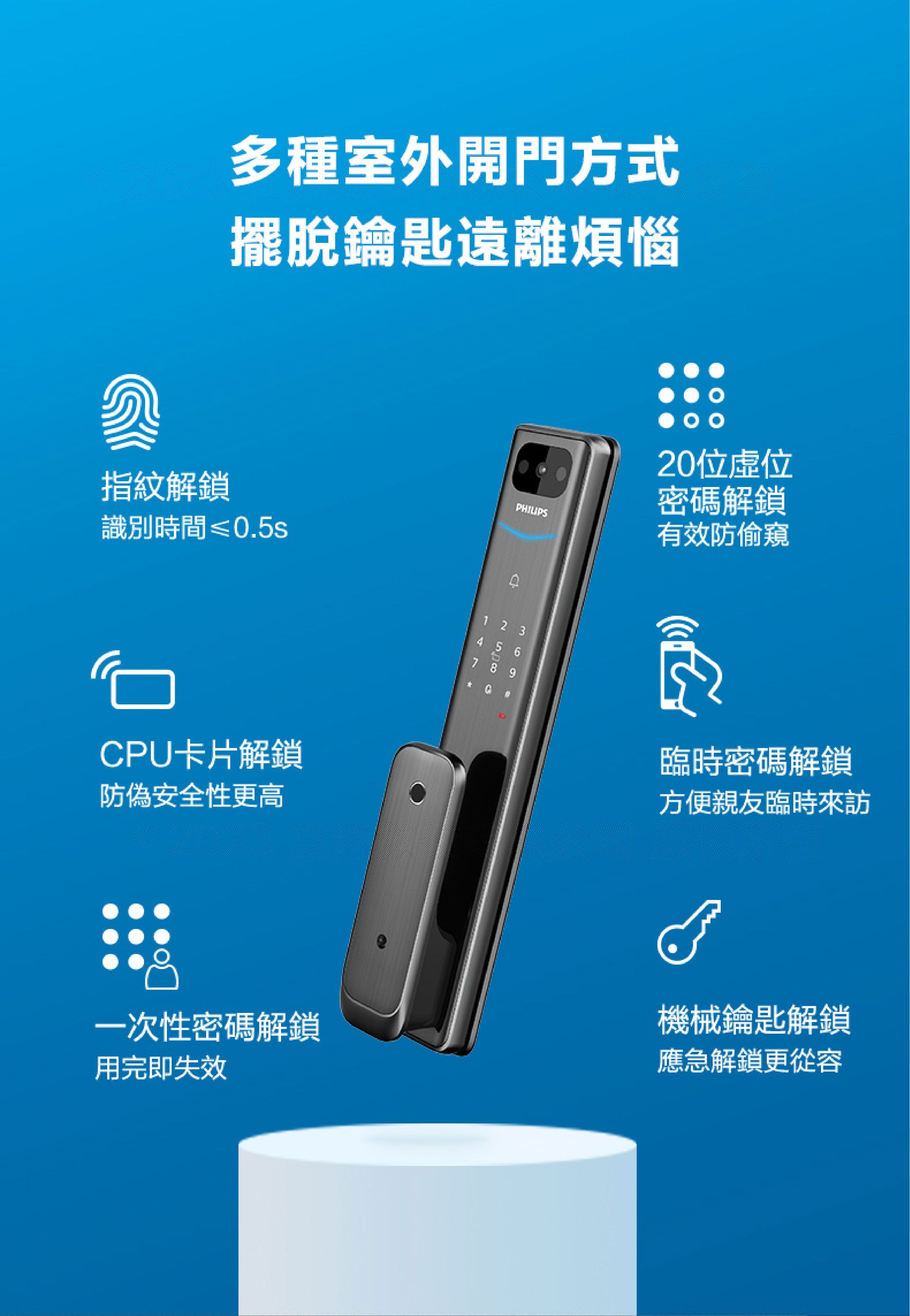 - 支援卡片與密碼解鎖等五種解鎖方式