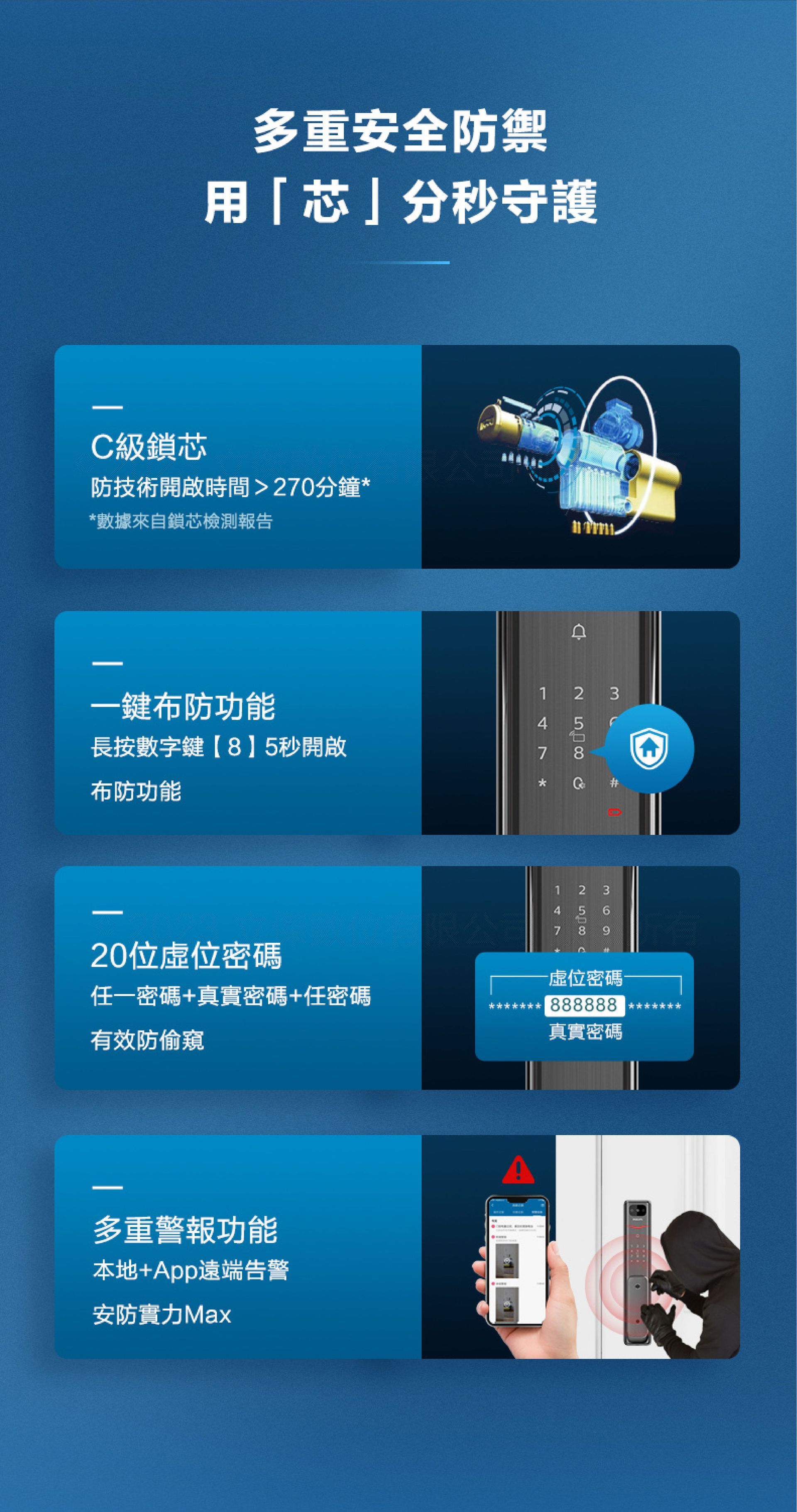 - 全自動鎖體及C級鎖芯,提升防盜性能
